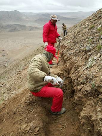 七月的高原,熾熱的太陽烘烤著大地,強烈的紫外線穿透衣服,像是要把人的皮膚撕下一樣,使人感到灼痛。我隊地勘二所新疆若羌縣庫木布拉克、阿其布拉克銅金普查項目的職工正拿著鐵鍬揮汗如雨,標(biāo)準(zhǔn)的、長長的探槽在他們腳下延伸,黑紅的臉頰皮膚皸裂。
