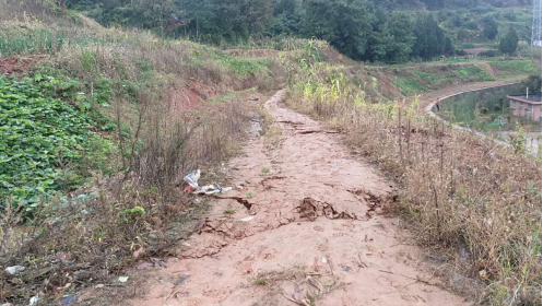滑坡體前部多處膨脹裂縫錯斷道路及排水渠