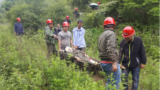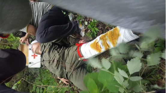 中午12點25分演練活動正式開始,野外地質(zhì)調(diào)查項目組一行3人上山采樣,下山途中一人腳下踩空滾下山坡,被樹木擋住,造成腿骨骨折、頭部擦傷、多處軟組織挫傷。事故發(fā)生后同組人員一邊利用現(xiàn)場急救物品向傷者施救,一邊向項目組組長匯報事發(fā)情況,請求支援。項目組長將情況馬上匯報給公司安全管理與保衛(wèi)部,同時立即組織人員帶著醫(yī)藥箱、斧頭、繩子等應(yīng)急物品開車迅速趕往事發(fā)現(xiàn)場。救援人員到達現(xiàn)場后按照劇情分工,迅速進入角色,各負其責,有人現(xiàn)場砍樹,有人制作簡易擔架、有人熟練進行骨折處理和包扎,很快將傷員抬到山下自備車中。